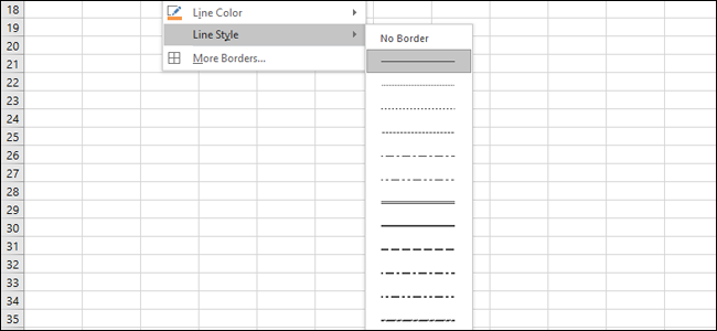 At the very bottom of the menu, clicking the “More borders” option opens up the “Format Cells” window to the “Border” tab. All of quick options you find on the menu are available in this screen, which might help you if you’re trying to apply multiple effects to selected cells quickly.